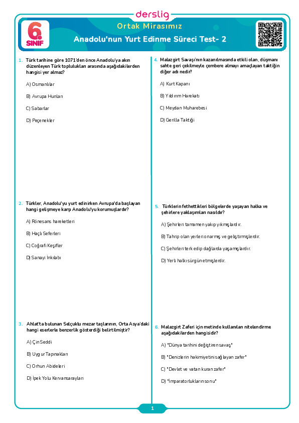 Anadolu'nun Yurt Edinme Süreci Test- 1