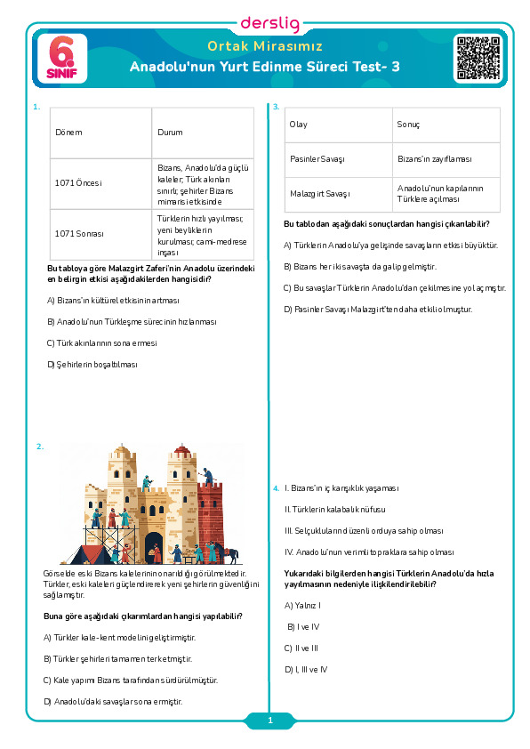 Anadolu'nun Yurt Edinme Süreci Test- 1