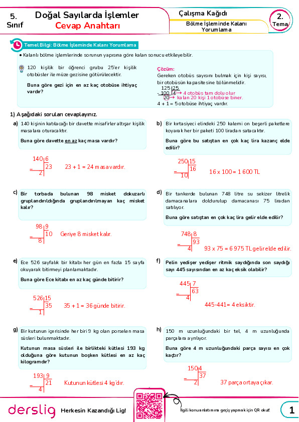 5. Sınıf 2. Tema 14. Konu Özeti(Bölme İşleminde Kalan Yorumlama) Cevap Anahtarı