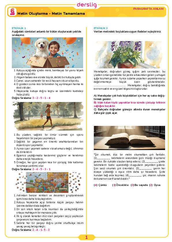 6.Sınıf 1.Tema 1.Konu (Gerçek, Mecaz ve Terim Anlam) Çalışma Kağıdı Cevap Anahtarı