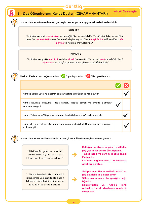 2. Sınıf 6. Hafta Cevap Anahtarı
