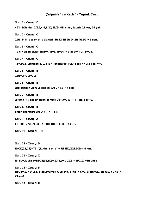 6.Sınıf 1.Tema 1.Konu (Bir Doğal Sayının Çarpanları ve Katları) Çalışma Kağıdı Cevap Anahtarı