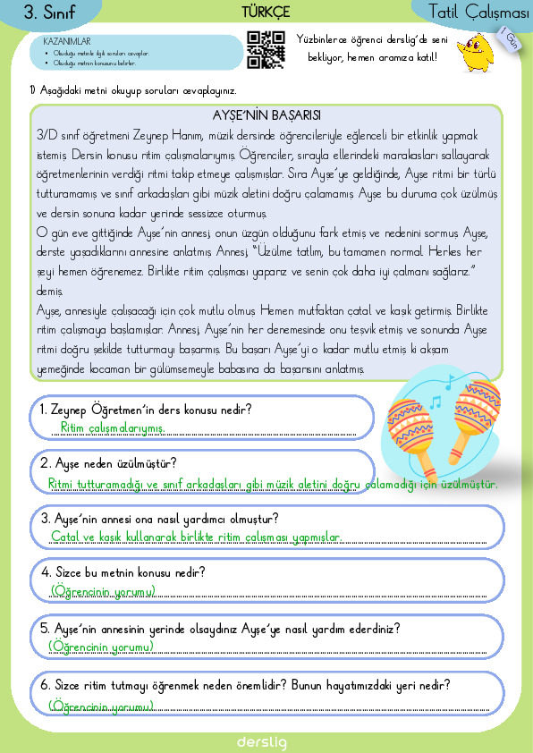 2. Sınıf 3. Hafta Ödevi Cevap Anahtarı