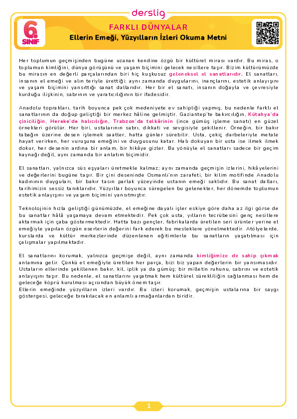 6. Sınıf 3.Tema Geleneksel El Sanatlarımızın Renkli Dünyası Okuma Metni