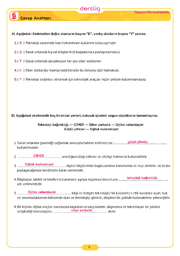 3. Sınıf Yarıyıl Tatil Çalışması cevap anahtarı