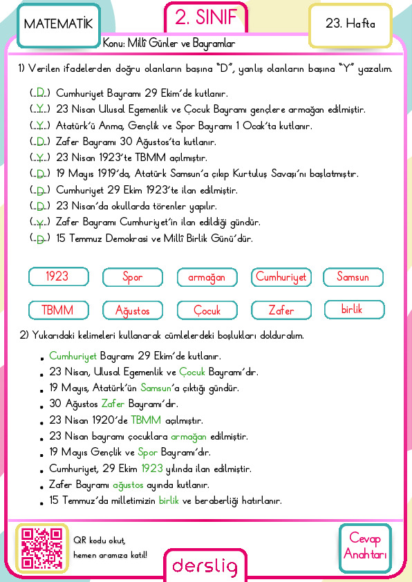 2. Sınıf Millî Gün ve Bayramlarımız Cevap Anahtarı