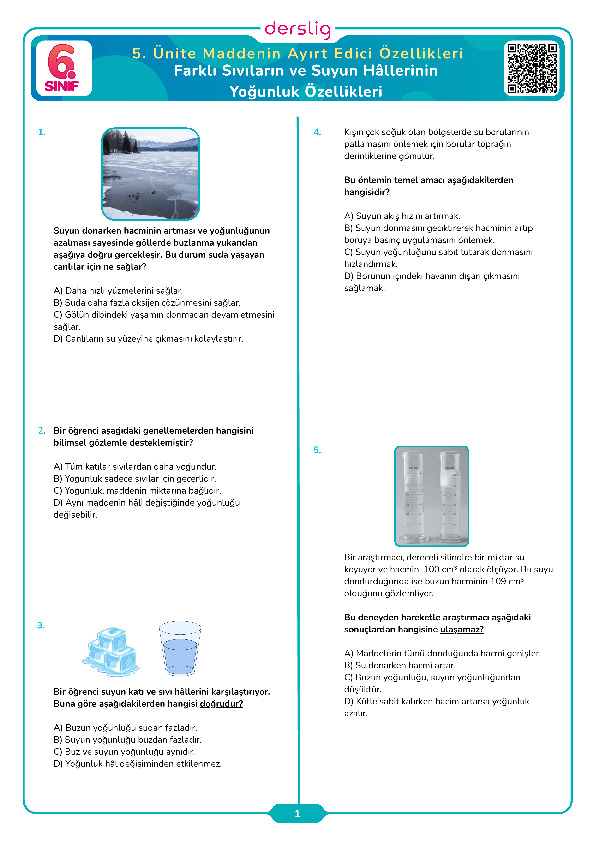 Farklı Sıvıların ve Suyun Hâllerinin Yoğunluk Özellikleri