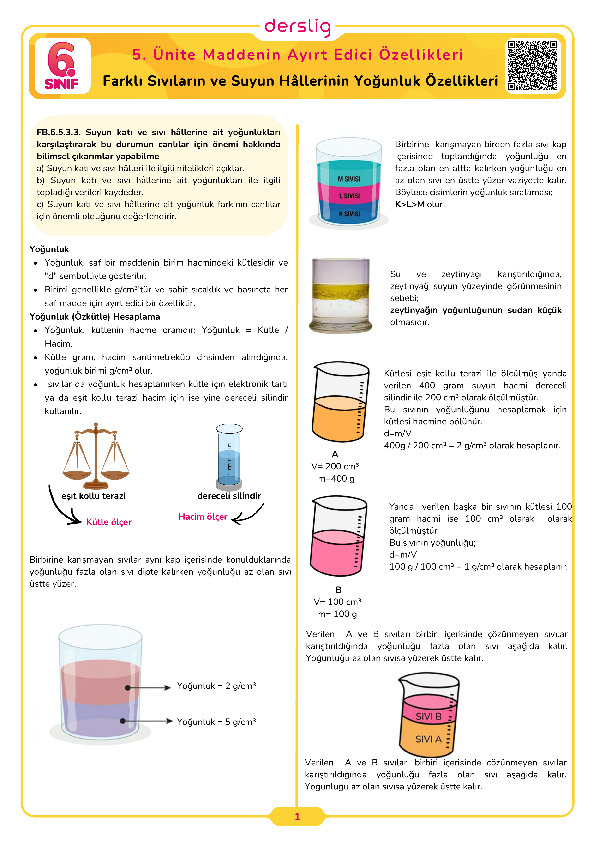 Farklı Sıvıların ve Suyun Hâllerinin Yoğunluk Özellikleri