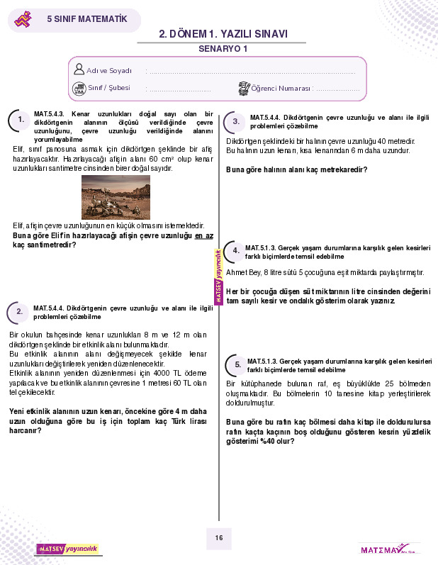 5. Sınıf 2. Dönem 1.Yazılı Çalışma Fasikülü (MATSEV)