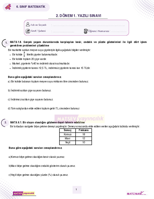 6. Sınıf 2. Dönem 1.Yazılı Çalışma Fasikülü (MATSEV)