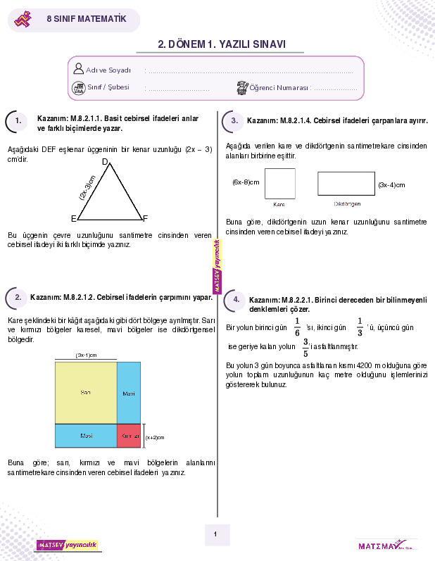 8. Sınıf 2. Dönem 1.Yazılı Çalışma Fasikülü (MATSEV)