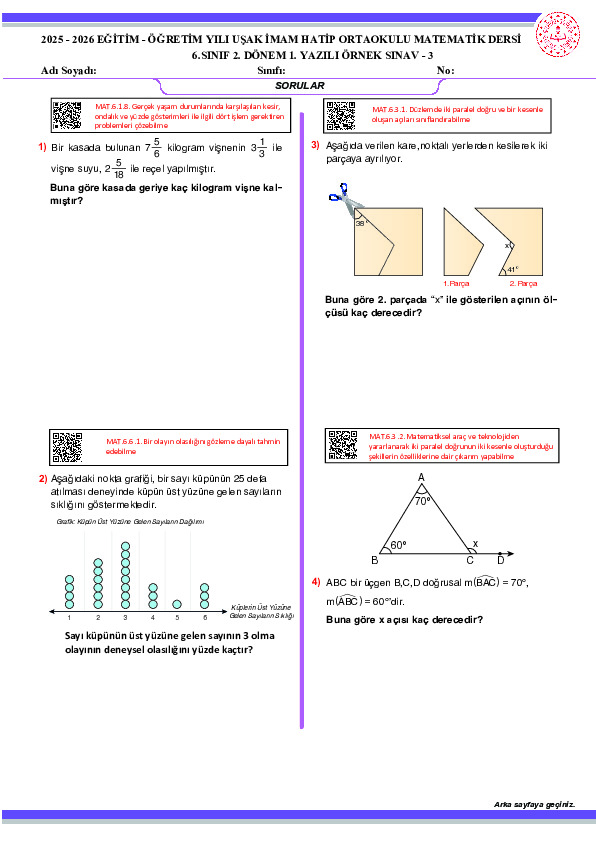 6. Sınıf 2. Dönem 1.Yazılı Örneği(2025-2026 Meb Ortak Sınav Senaryosu)(MATSEV)