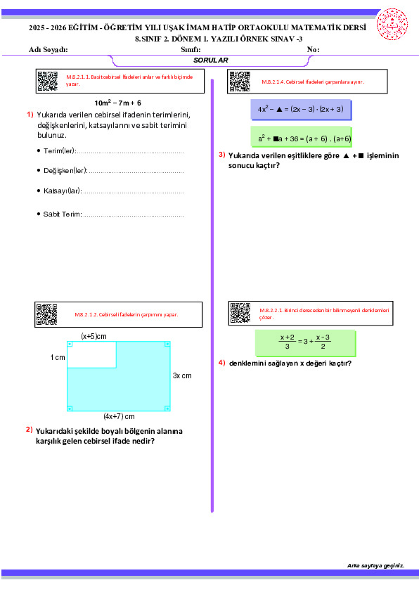 8. Sınıf 2. Dönem 1.Yazılı Örneği(2025-2026 Meb Ortak Sınav Senaryosu)(MATSEV)