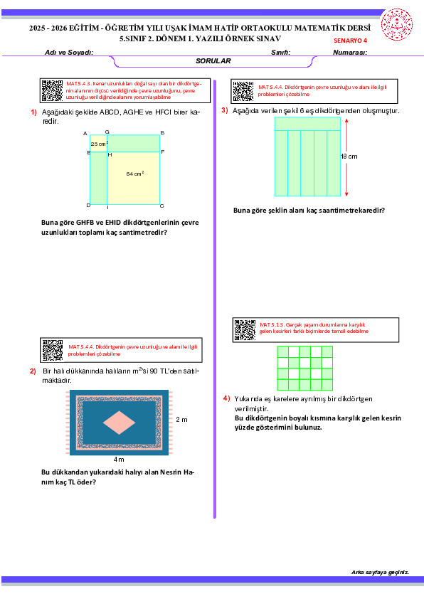 5. Sınıf 2. Dönem 1.Yazılı Örneği(2025-2026 Tüm Senaryolar)(MATSEV)
