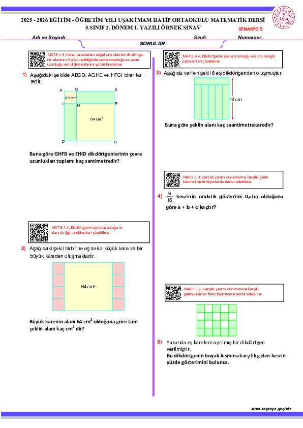 8. Sınıf 2. Dönem 1.Yazılı Örneği(2025-2026 Meb Ortak Sınav Senaryosu)(MATSEV)