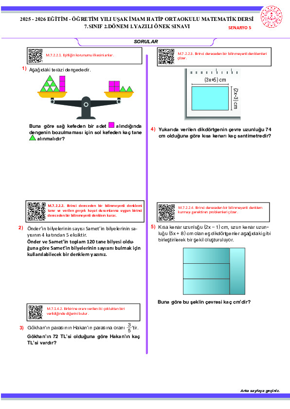 7. Sınıf 2. Dönem 1.Yazılı Örneği(2025-2026 Tüm Senaryolar)(MATSEV)