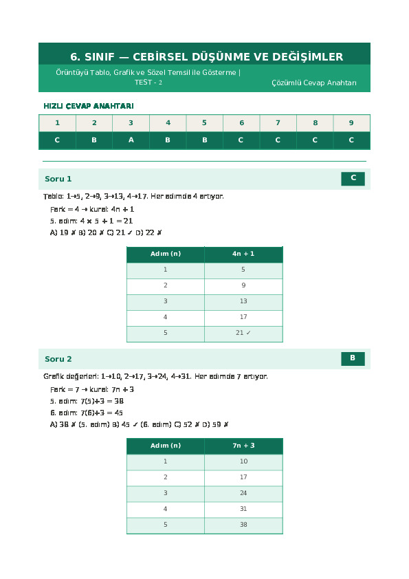 2. sınıf Sayı ve Sayı Temsiline Dönüşen Şekil Örüntüleri Cevap Anahtarı
