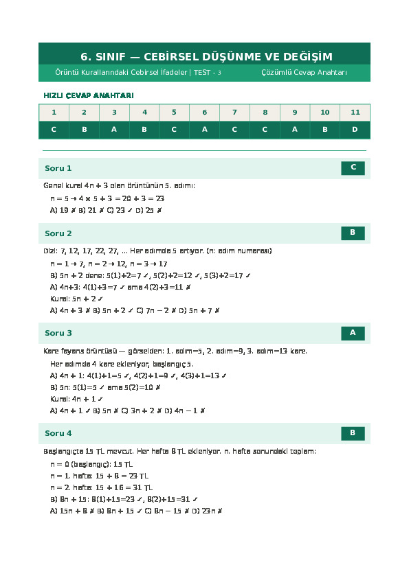 1. Sınıf 11. Hafta Cevap Anahtarı