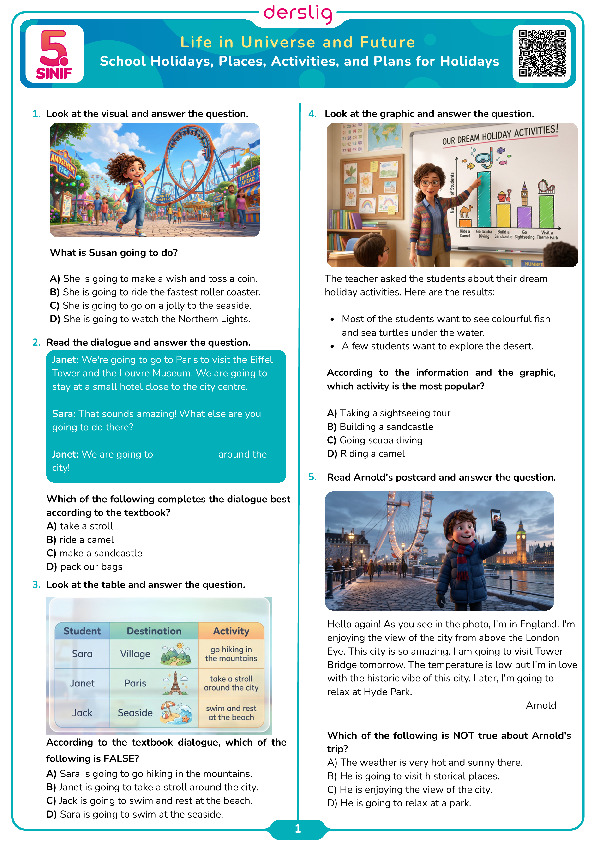 School Holidays, Places, Activities, and Plans VOCABULARY QUIZ
