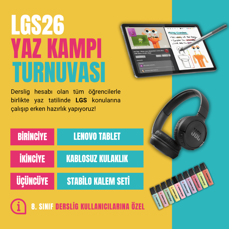 Derslig'de LGS26 hazırlığı yaz tatili turnuvası ile başlıyor! 14 Temmuz - 8 Ağustos tarihleri arasında her gün en az 50 puan topla, elenmeden turnuvayı tamamla, sürpriz ödüllerden biri senin olsun!