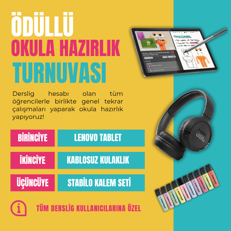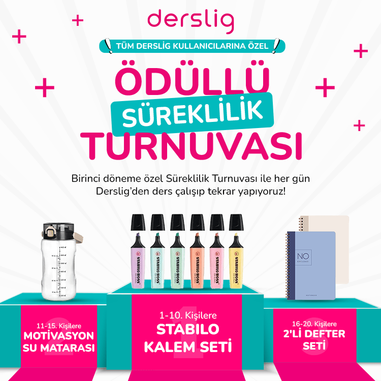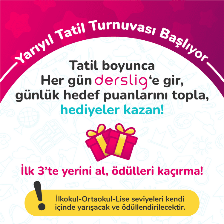 Derslig'de turnuva heyecanı başlıyor! Hem yazılılara hazırlan hem de sürpriz ödüller kazan! Turnuva boyunca her gün en az 50 puan topla, elenmeden turnuvayı tamamla, sürpriz ödüllerden biri senin olsun!